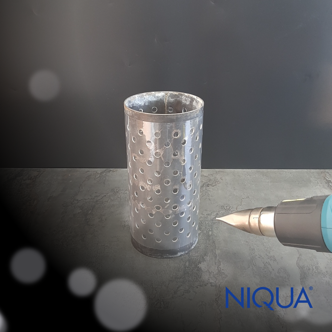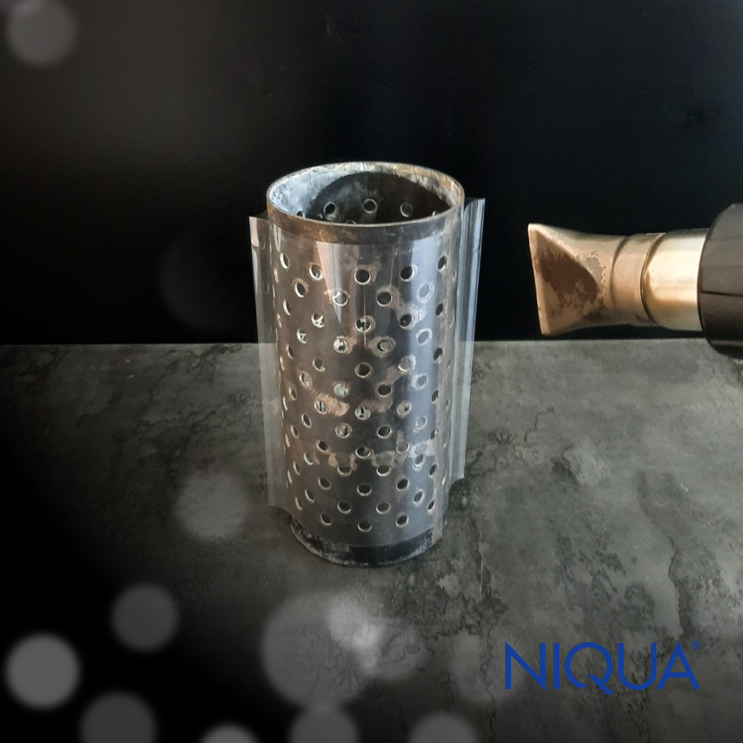 Durch Erhitzen mit dem Heißluftfön oder durch das Eintauchen in ein heißes Wasserband zieht sich die Schrumpffolie um die Küvette zusammen.